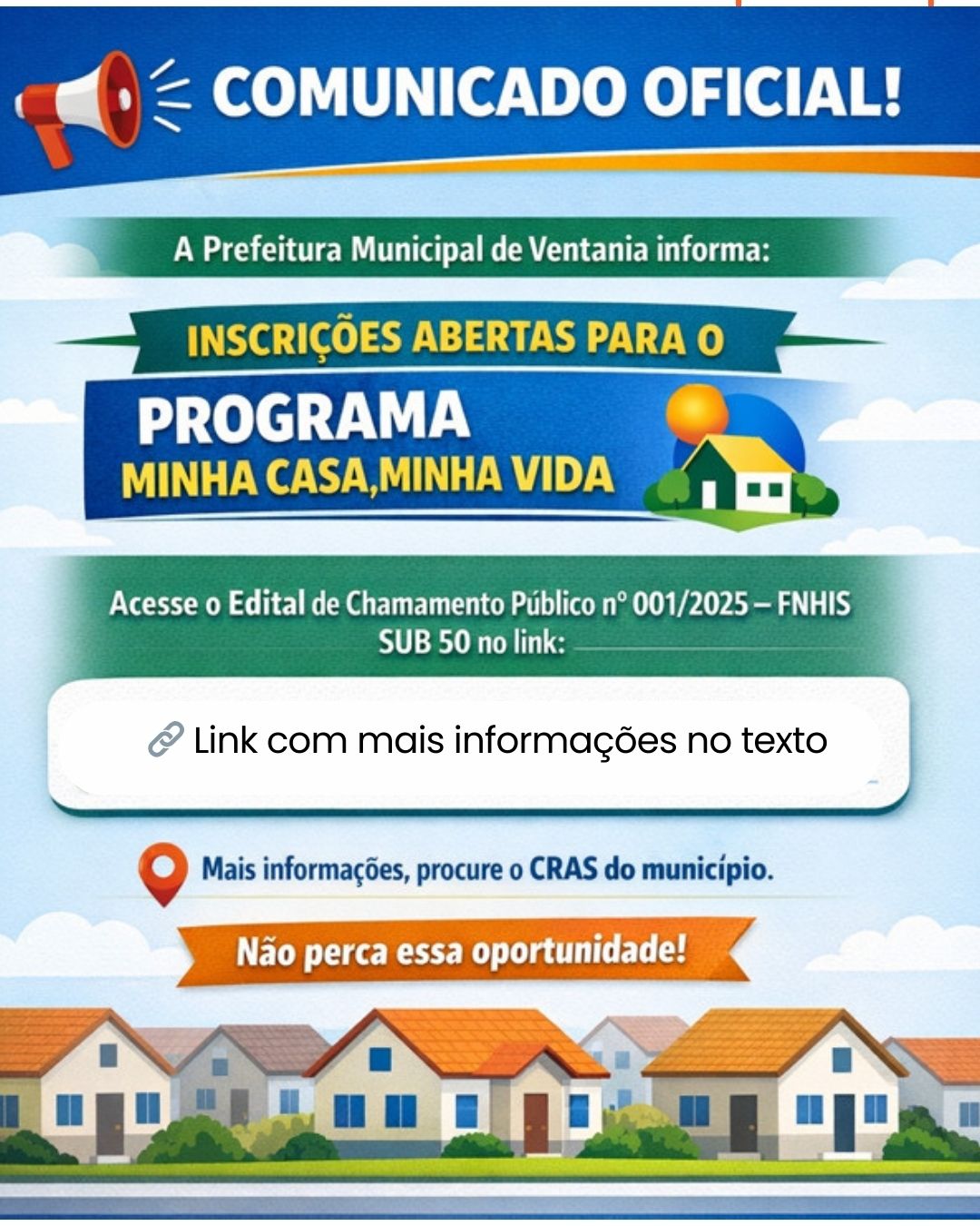 A Prefeitura Municipal de Ventania informa que já estão abertas as inscrições para o 🏠 Programa Minha Casa, Minha Vida.