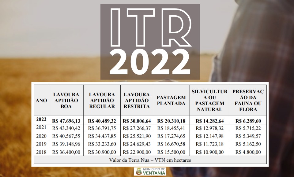 Confira os valores do ITR do ano de 2022 para o nosso município