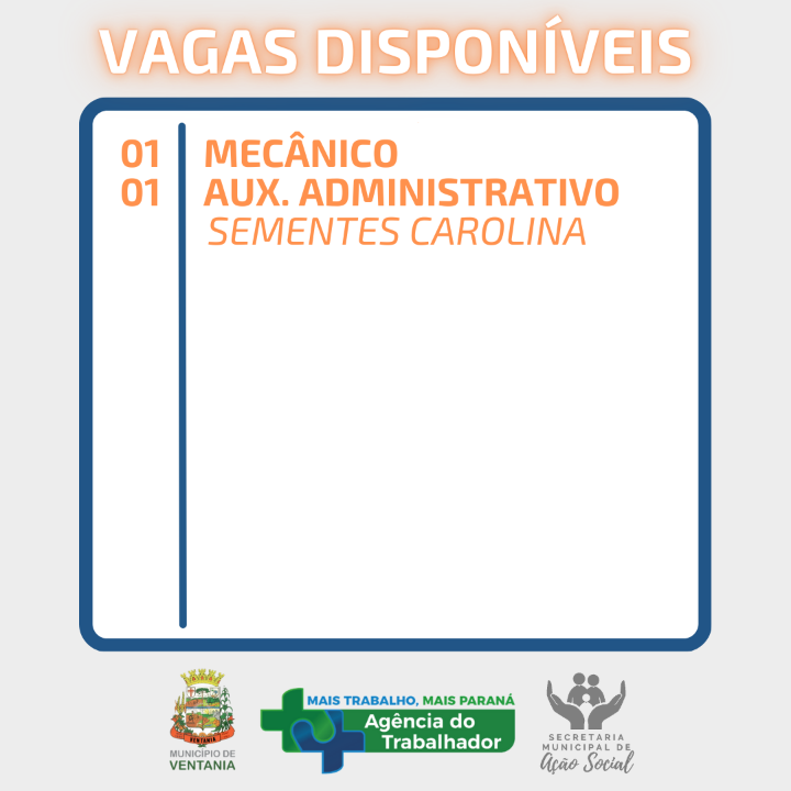 O Posto Avançado do Trabalhador de Ventania disponibilizou no dia de hoje (07/03) vagas de emprego para 03 (três) áreas.