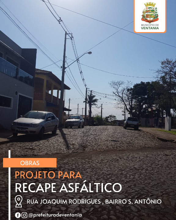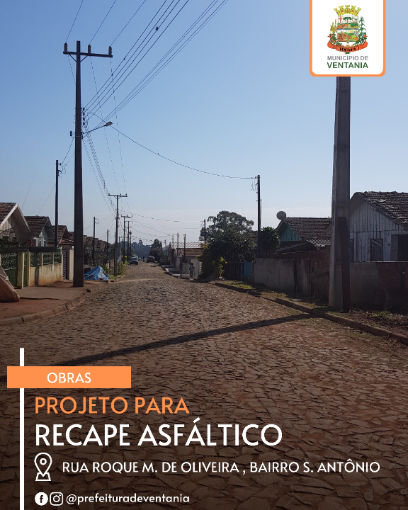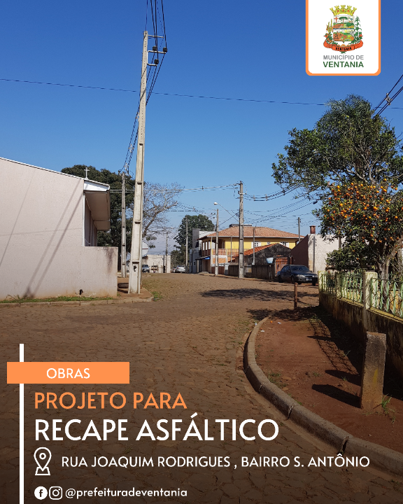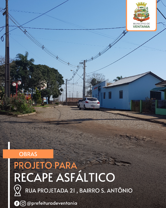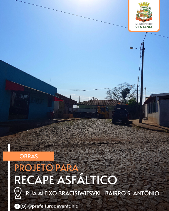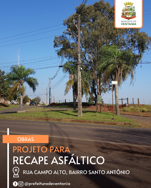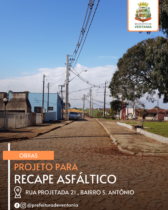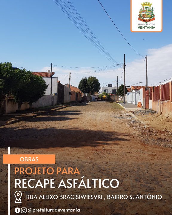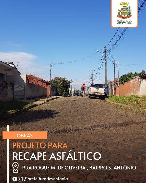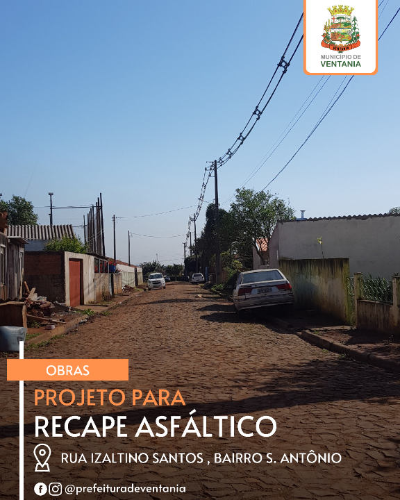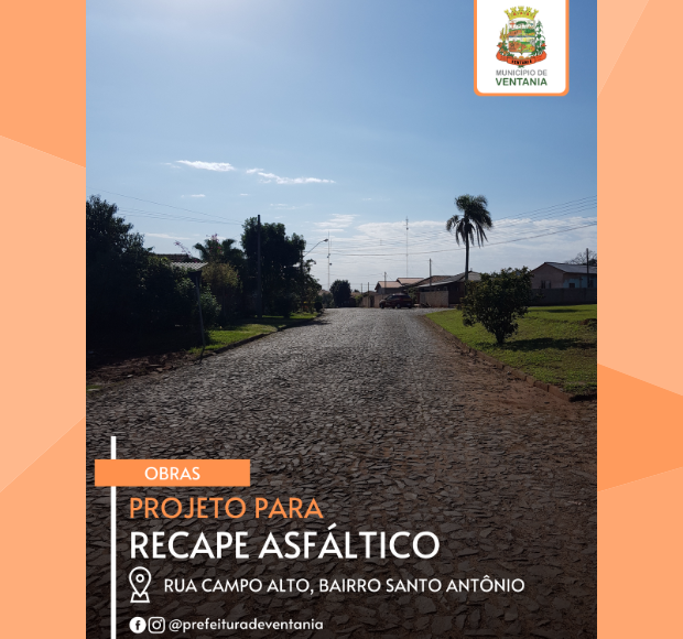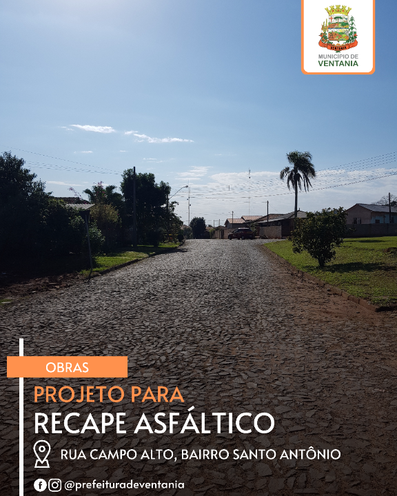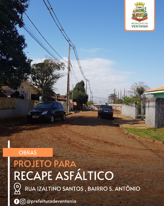 A Prefeitura de Ventania iniciou o projeto de recape asfáltico para o bairro Santo Antônio, e em breve irá abrir o processo de licitação para a execução das obras que serão realizadas através de recursos próprios do nosso município.