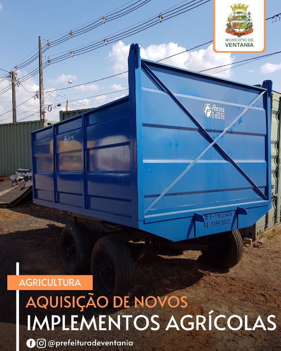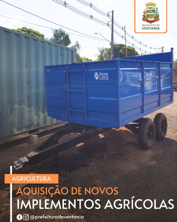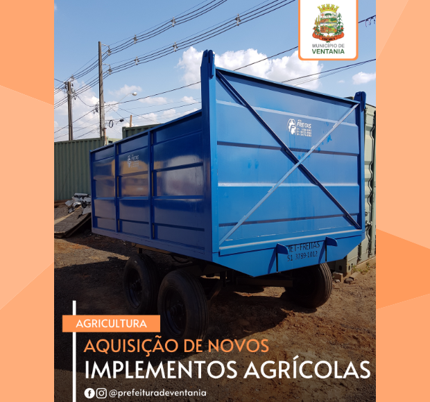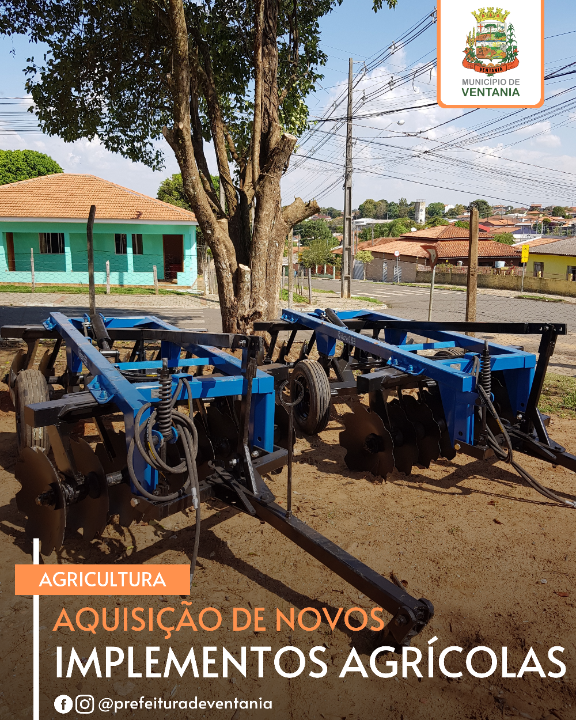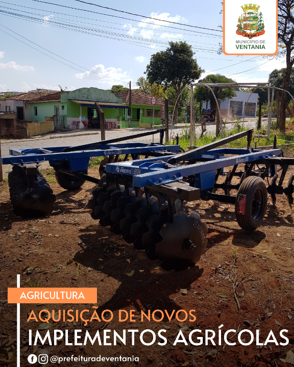 E na última semana a Secretaria de Agricultura e Pecuária recebeu 03 desses novos implementos agrícolas, sendo 02 grades aradoras, e 01 carreta agrícola, e a Prefeitura de Ventania junto a Secretaria de Agricultura e Pecuária aguardam receber em breve o trator e a roçadeira das empresas vencedoras do processo licitatório o mais breve possível.