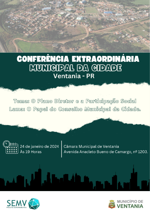 A Prefeitura de Ventania convida a todos para participar da Conferência Extraordinária Municipal da Cidade Ventania/PR com o tema ?O Plano Diretor e a Participação Social? com o lema ?O Papel do Conselho Municipal da Cidade?.
