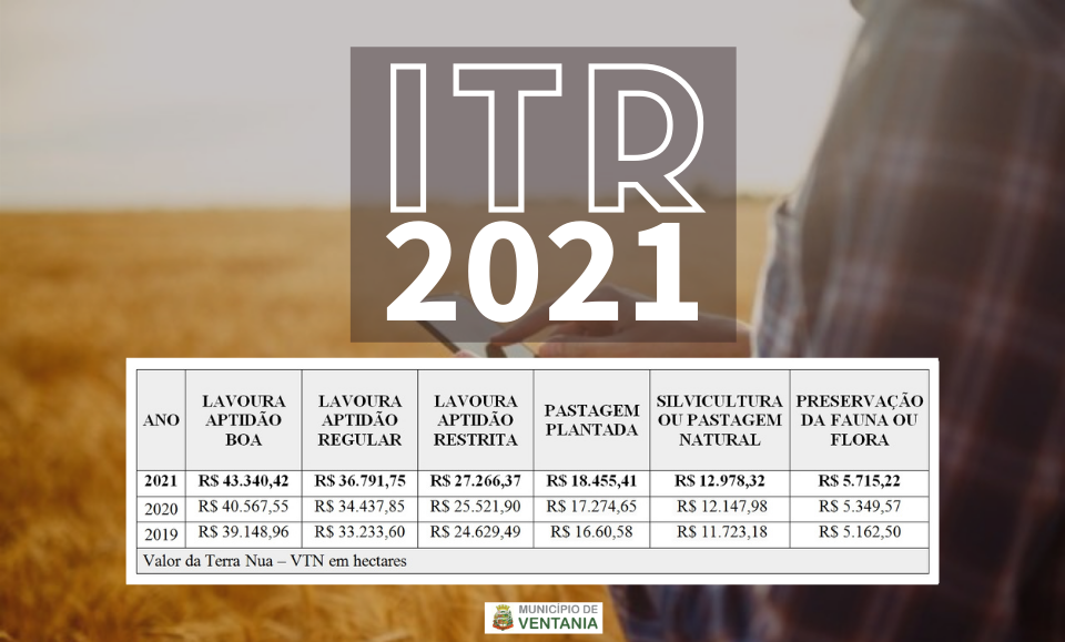 Para ajudar o contribuinte a realizar a Declaração do ITR, segue abaixo os valores apurados a partir de 2015, separados por aptidão agrícola. Vale ressaltar que os valores repassados pela Prefeitura Municipal deverão ser adotados por contadores ou contribuintes na DITR, pois os mesmos servirão como valores base para posteriores fiscalizações.
